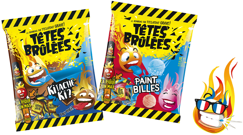 Toute la famille va adorer les 4 associations de ces bonbons gélifiés piquants aux goûts citron-citron vert, mûre-fraise, pêche-abricot ou 100% cola ! Ces bonbons se situent au 1er niveau de la jauge d’intensité des Têtes Brûlées : « ça pique ». Ces nouveautés « veggie » (sans gélatine) et son nouveau format en mini-sachets raviront le plus grand nombre des amateurs de bon- bons.