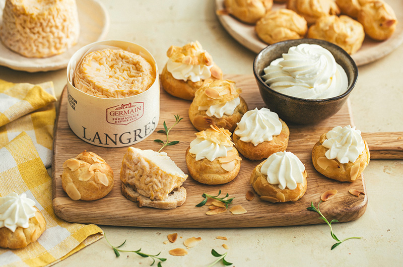 Généreusement garnies d’une chantilly au Langres AOP, ces bouchées allient la légèreté de la pâte à choux à la richesse du fromage, relevées par le croquant des amandes grillées.