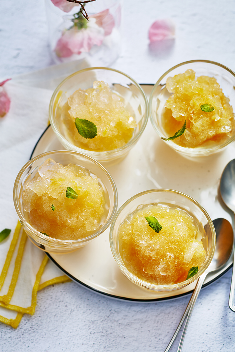 Servir les granités dans des verrines, ou des coupes bien froides, parsemés de menthe fraîche.