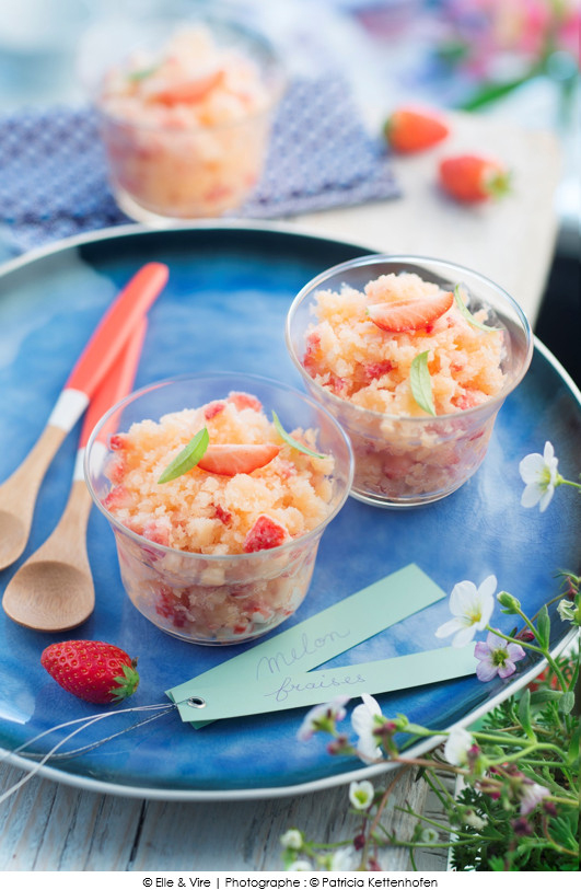 ④• Laver, équeuter puis couper les fraises en cubes. Mélanger les dés de fraises avec le granité au melon et répartir dans des verres.