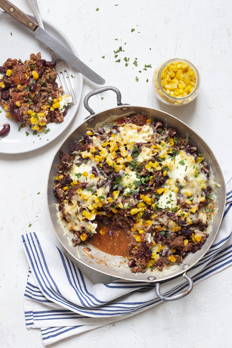 Un gratin à la mexicaine avec du maïs à partager entre amis lors d'une soirée à thème.