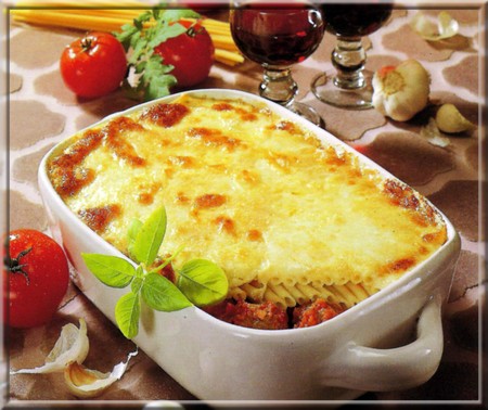 3.Frotter un plat à four avec l'ail. Le beurrer. Répartir la préparation précédente sur le fond du plat. Saupoudrer de basilic et étaler les macaronis par-dessus. Saupoudrer de parmesan.