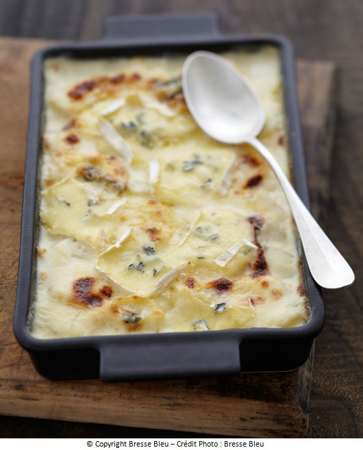 3• Tailler le Bresse Bleu en fines lamelles. Monter les tranches de pommes de terre en couches successives dans un plat à gratin, en intercalant des lamelles de Bresse Bleu entre chaque couche (en réserver quelques-unes). Poivrer au moulin, régulièrement (ne salez pas, le fromage l’est déjà).