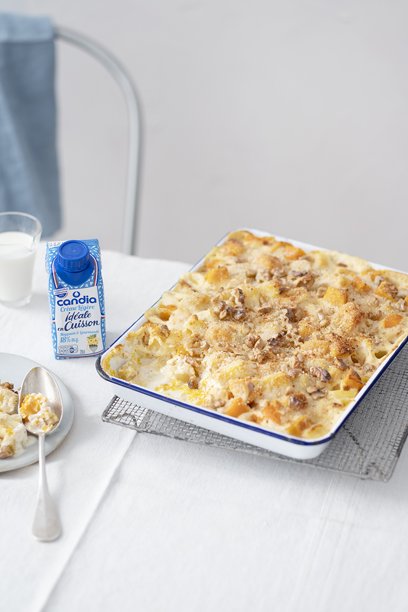 C’est le temps des premiers frimas, des arbres roux, des délicats flocons de neige et le temps des plats gourmands et réconfortants. Alors, si on cuisinait un gratin, crème infusée au pecorino, aux légumes d’automne avec la nouvelle crème Candia « Idéale en cuisson. »