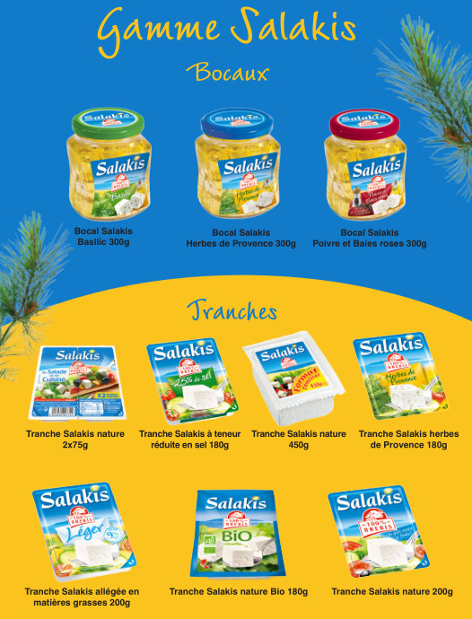 Présentés en tranches dans des barquettes, ou en petits dés marinés dans de l'huile agrémentée d'herbes et d'aromates, les fromages Salakis se dégustent tels quels ou agrémentent des salades composées. Mais leur goût unique en fait de véritables compagnons culinaires, capables d'ensoleiller bien des recettes, auxquelles ils donnent un petit plus méditerranéen !
