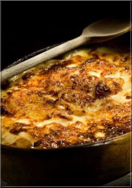 4- Disposer les pommes de terre dans un plat à gratin légèrement beurré, mettre un peu de la crème de cuisson, ajouter les lamelles de Comté entre les rondelles, puis le Comté râpé au final.