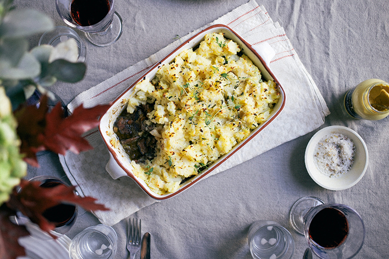Gratin de bœuf irlandais, thym, oignons et sa purée de céleri