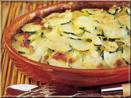6.Beurrez un plat à gratin, déposez-y une couche de pommes de terre et une couche de courgette, étalez une couche de crème et quelques tranches d'époisses, assaisonnez. Réitérez l'opération jusqu'à épuisement des ingrédients en terminant par une couche de fromage.