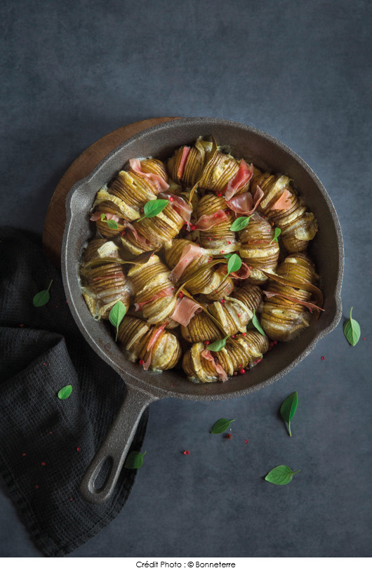 ⑩• Intercaler des tranches de reblochon et des lanières de jambon cru Bonneterre sur chaque pomme de terre et effeuiller un peu de thym.