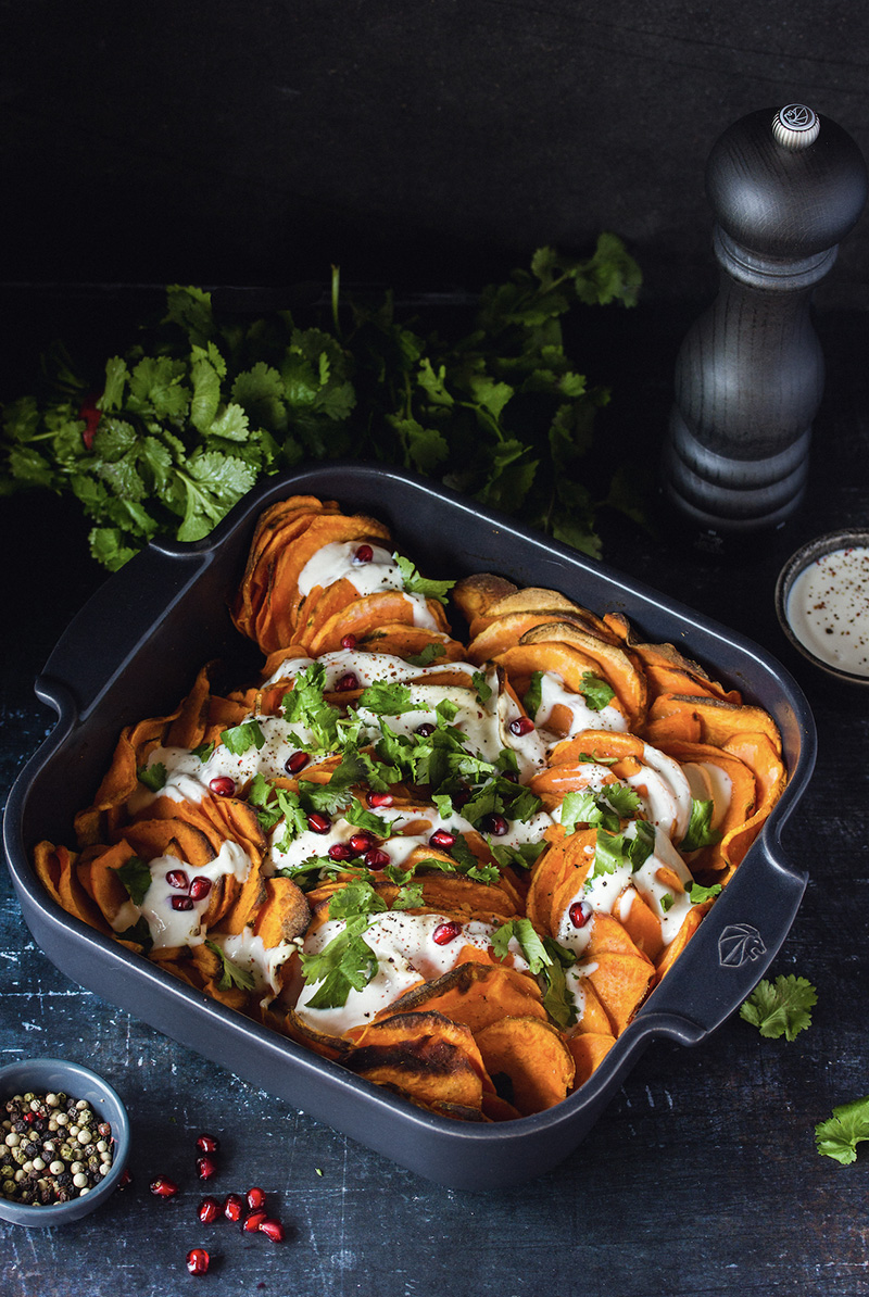 Gratin de patates douces, sauce au yaourt et graines de grenade
