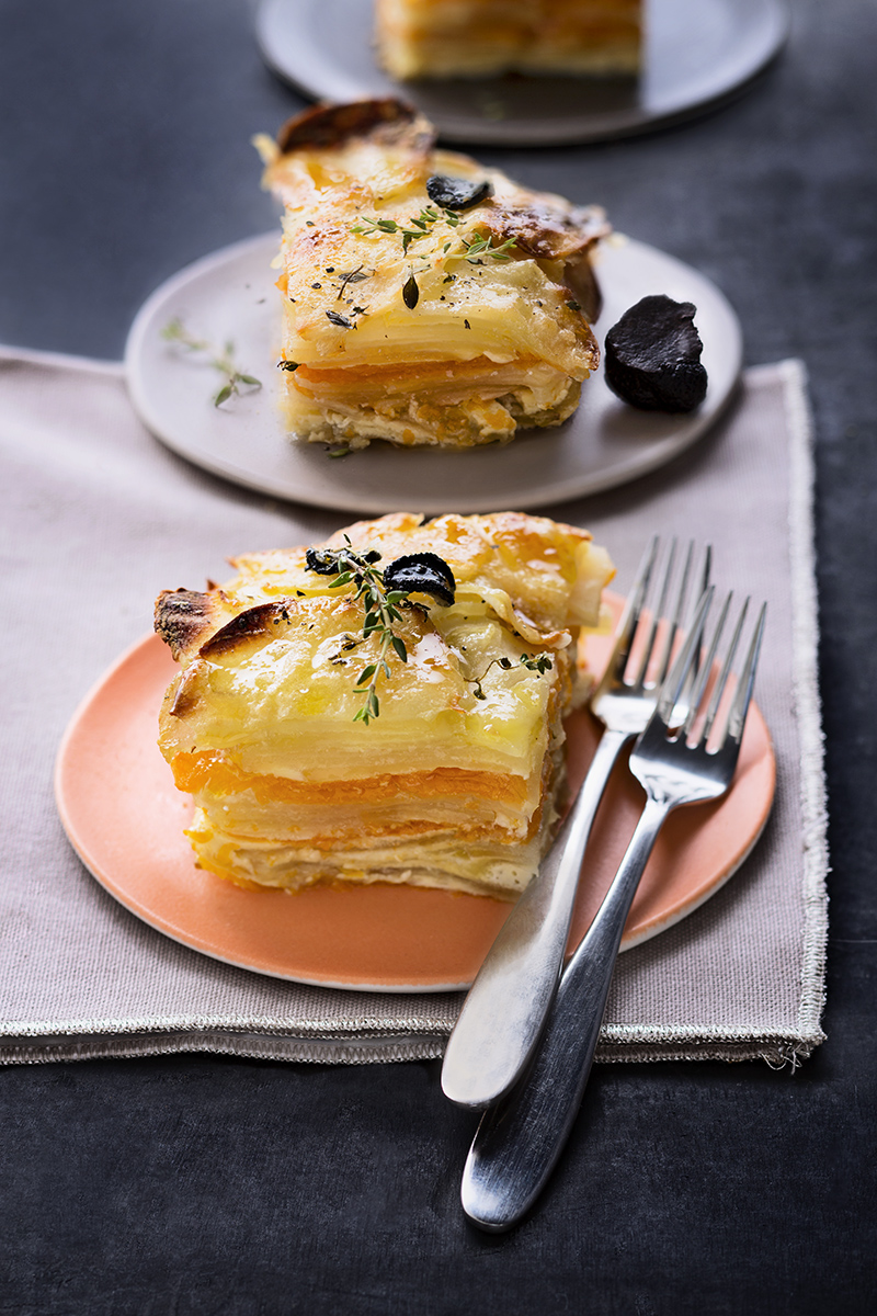 Envie d'une recette chic et gourmande pour les fêtes ? Impressionnez votre famille avec ce gratin de pommes de terre au potiron et à la truffe.