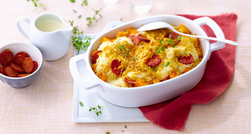②• Couper le potiron en cubes, retirer la peau et le faire cuire dans l'eau bouillante jusqu'à ce que la chair puisse être facilement traversée par la lame d'un couteau. Une fois cuits, placez-les dans un plat à gratin.