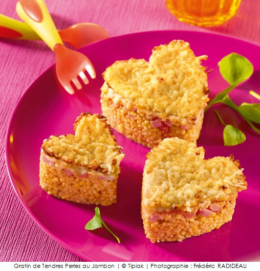 3• Déposez les Tendres Perles TIPIAK dans un plat allant au four, puis ajoutez les dés de jambon.