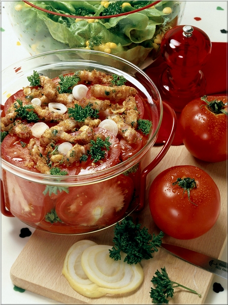 8- Alterner rangs de tomates et de farce qui restera en couche supérieure. Saler, poivrer. Ajouter 1/2 cuillère à café de sucre.