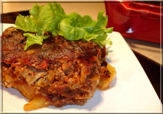 * Pendant ce temps, préchauffer le four à 180°C. Éplucher les pommes de terre, les couper en fines rondelles et les placer dans le fond d’un plat à gratin. Parsemer de fêta émiettée, puis verser la moitié de la viande sur les pommes de terre. Couper les champignons en lamelles et les placer sur la viande et remettre une couche de viande.
