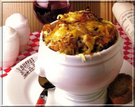 Remplir 4 bols du bouillon aux oignons. Ajouter 3 rondelles de pain par bol.