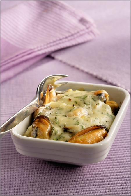 Répartir les moules dans des cassolettes, les napper de sauce et faire légèrement dorer la surface en passant 1 minute sous le grill.