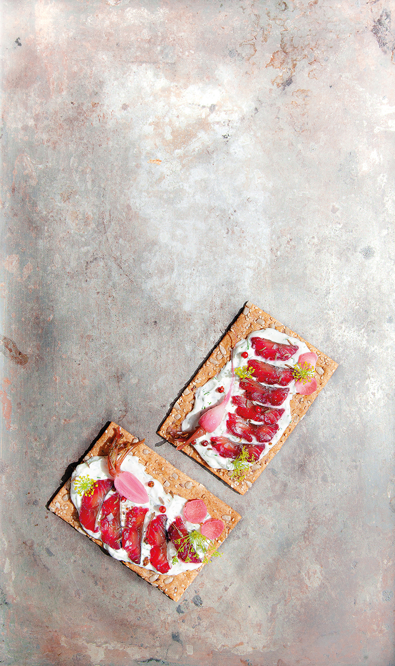 ⑥• Le lendemain, rincer rapidement les filets et les recouvrir d’une couche régulière de betterave hachée finement.