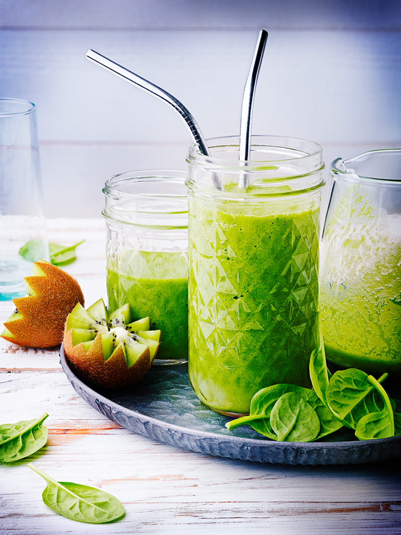 ①• Épluchez le kiwi, lavez la poire et retirez le cœur. Coupez-les en morceaux et mettez-les dans un blender avec les épinards coupés, le yaourt, la purée d'amande et 200 ml d'eau froide.
