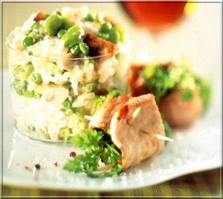 5- Pendant la cuisson du risotto : préparer les grillades de porc : saisir la viande à la poêle. Saler, poivrer et arroser d’un trait de jus de citron. Sur chaque grillade, poser un bouquet de cerfeuil. Rouler la viande sur elle-même et maintenir avec une pique.