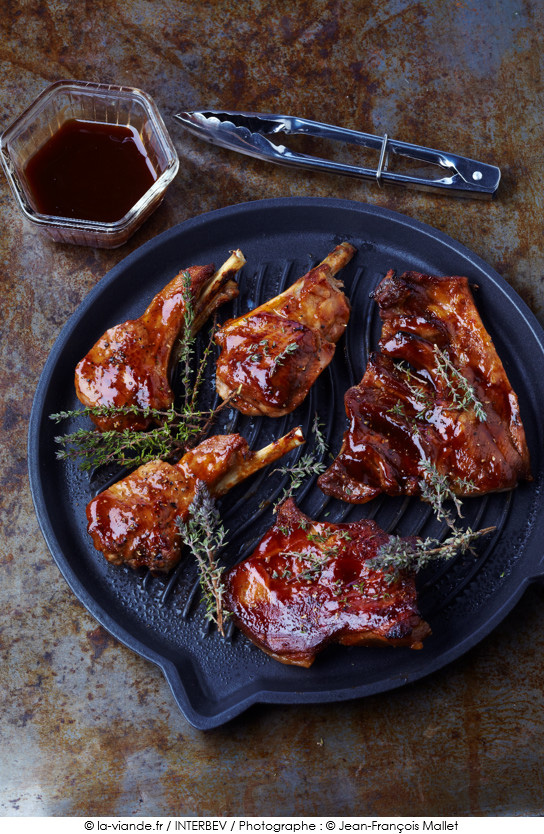 ⑥• Mélanger la marinade et la sauce barbecue, disposer la viande d’agneau dans un grand plat, la recouvrir de sauce, la cuire 8 à 10 minutes au four, la retourner lorsqu’elle commence à caraméliser et poursuivre la cuisson 10 minutes en arrosant régulièrement avec la sauce.