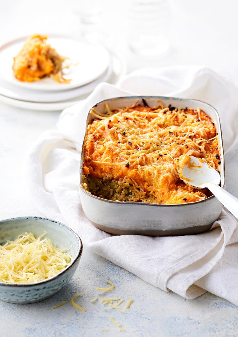 ④• Garnissez le fond d’un plat du mélange de légumes et quinoa puis recouvrez avec les échalotes caramélisées. Ajoutez une couche de patates douces et recouvrez le tout de Râpé Fin & Fondant.