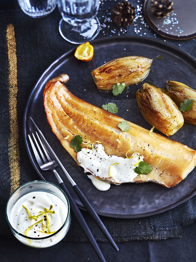 Haddock poché au lait, endives braisées à l’orange et sauce au yuzu