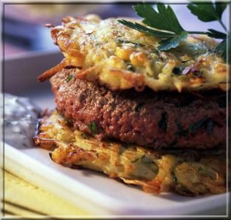 8.Incorporer les quatre épices et le persil haché à la viande hachée. Saler, poivrer et diviser la viande en 4 parts égales. Leur donner la forme de galettes et les faire griller 3 min de chaque côté.