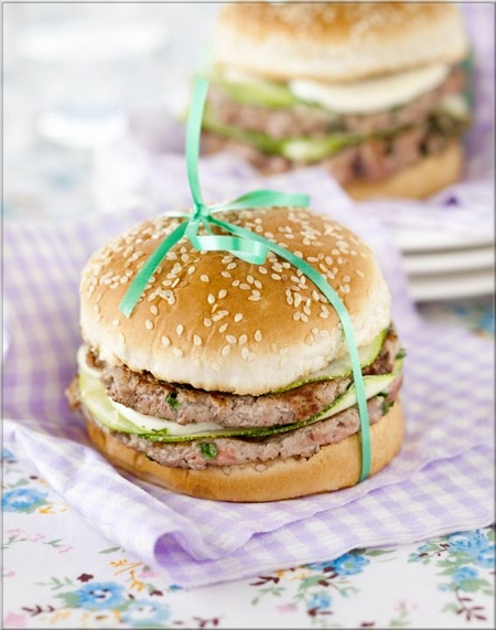 6.Poser le premier steak puis une fine couche de rondelles de courgette crue disposées en rosace, ensuite la tranche de mozzarella et recommencer avec le deuxième steak, courgette et mozzarella. Recouvrir avec l’autre moitié de pain. Presser légèrement.
