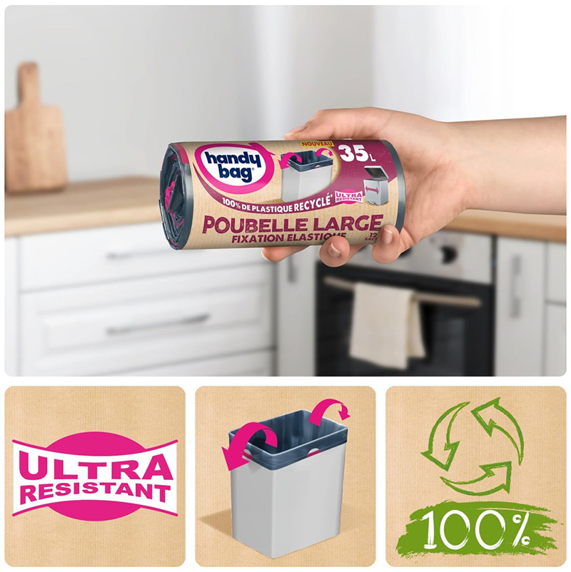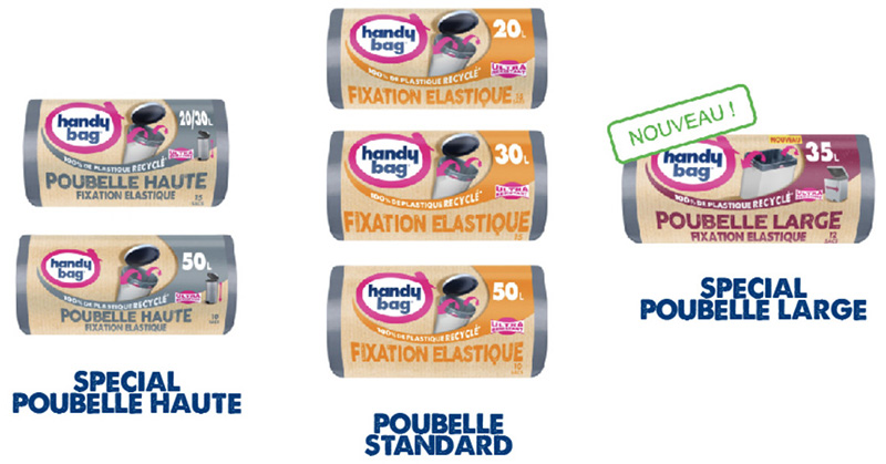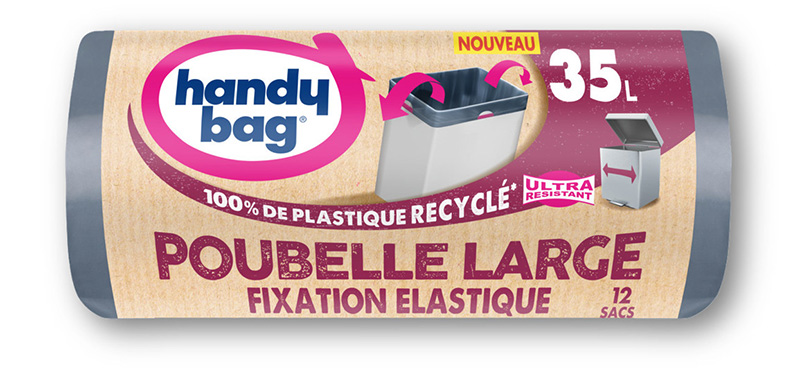 Ce nouveau format vient compléter la gamme Fixation Élastique Handy Bag®, déjà disponible en format standard pour les poubelles classiques et en format spécial poubelles hautes, offrant à chaque foyer une solution adaptée pour une gestion des déchets ménagers plus pratique et efficace.