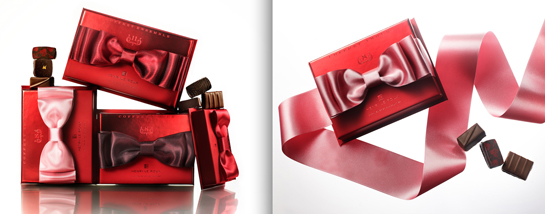 Un joli coffret de chocolats, couleur rouge feu, délicatement noué par un ruban de velours, marques de la douceur, de la sensualité, pour célébrer avec passion l’amour avec un grand A.