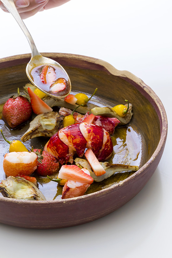 Homard en cocotte et fraises Gariguette Label Rouge, jus minute, artichaut poivrade