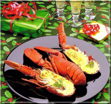 3-Avec un couteau,fendre les homards en deux dans le sens de la longueur.Les installer sur un grand plat de sabayon la chair du coffre et de la queue.Faire gratiner à four chaud 230°C (th.7/8) 6 à 8 min jusqu'à ce que le dessus soit bien doré.Servir aussitôt.