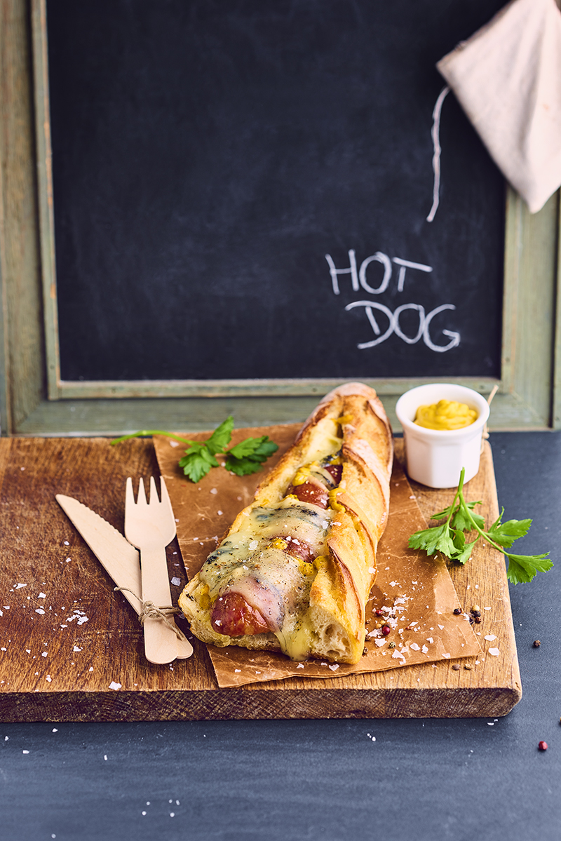 Hot-dog à la saucisse de Montbéliard et Morbier fondu