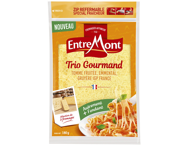 Les Français sont des fondus de fromages râpés spéciaux ! Ils en ont acheté 7 900 tonnes en 2019 1 ! Pour répondre à leurs envies « de goût fruité et de texture généreusement fondante »2, Entremont, le spécialiste du fromage 100% « Made in France », lance son râpé « Trio Gourmand », réunissant dans un même sachet : Tomme Fruitée, Emmental et Gruyère IGP France ! Une sélection inédite de 3 fromages de qualité en brins épais qui s’unissent parfaitement pour une texture généreuse et nappante à chaud et un goût fruité et gourmand !