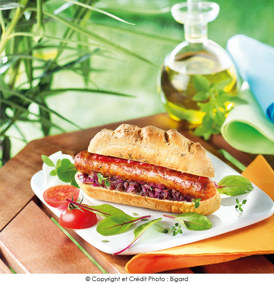 Le petit Plus du Chef : remplacer les pains à Hot-dog par des pains moelleux aux olives et fleur de thym, confectionnés par votre boulanger.
