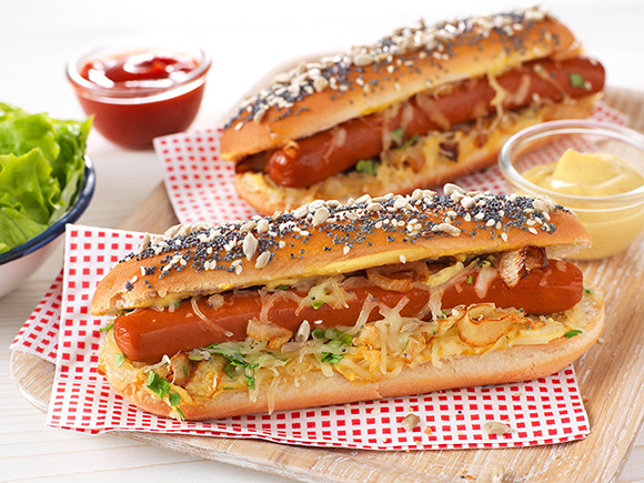 ②• Ouvrez les pains, badigeonnez l’intérieur de moutarde (haut et bas), ajoutez la moitié d’emmental, placez la saucisse, répartissez les herbes fraîches ciselées, les oignons frits, de nouveau de l’emmental et fermez.