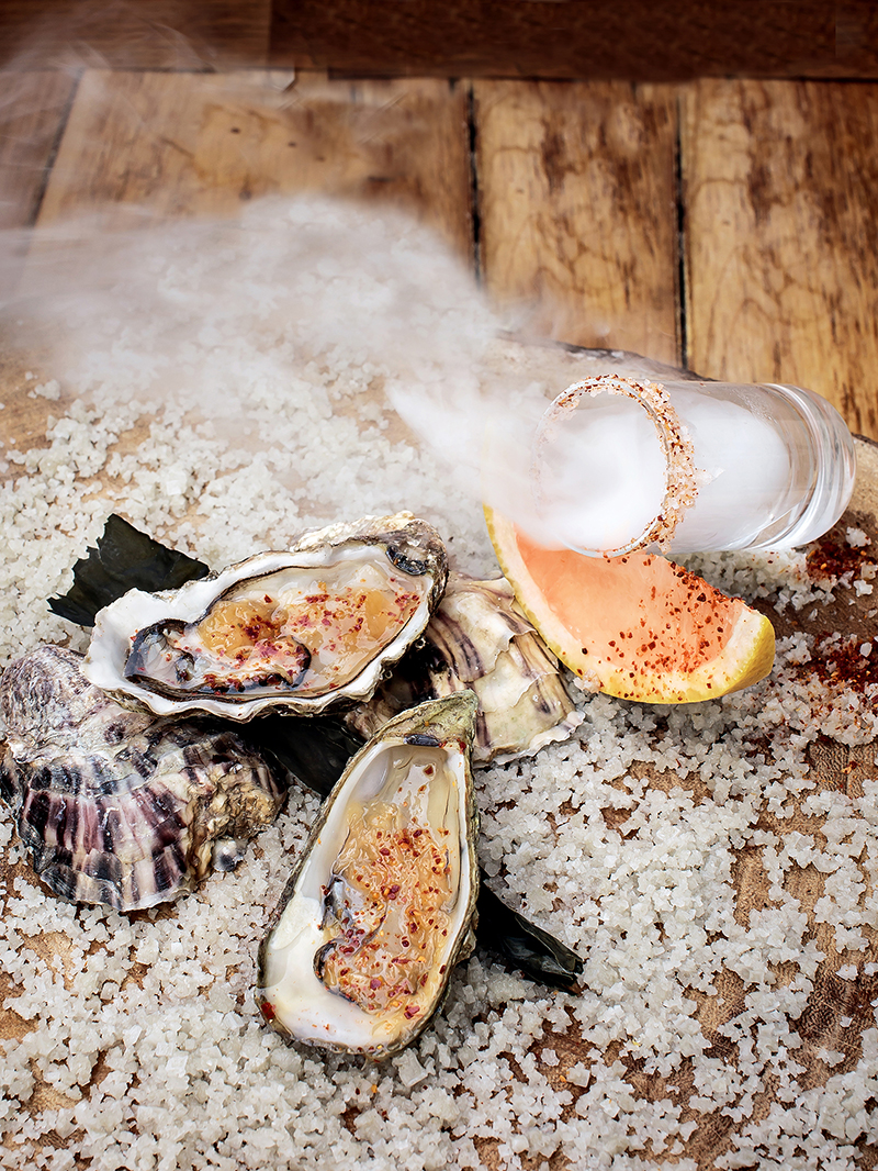 Huîtres au naturel, Mezcal, pamplemousse de Floride compoté au miel et piment de Cayenne