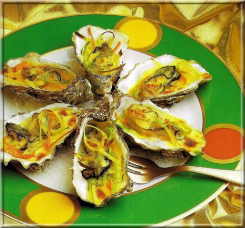 3-Disposer les coquilles dans une plaque à four en les calant sur un lit de gros sel. Garnir chacune d'elles avec la julienne et une huître pochée.
