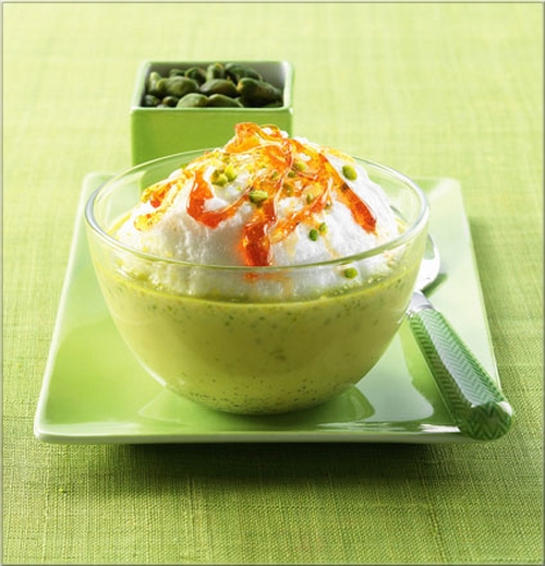 3.Filtrez la crème à travers un chinois et finissez d’écraser les pistaches afin de bien lier le tout. Plongez le bol contenant la crème dans un récipient rempli de glaçons afin de la faire refroidir, remuez de temps en temps, filmez et réservez au frais.