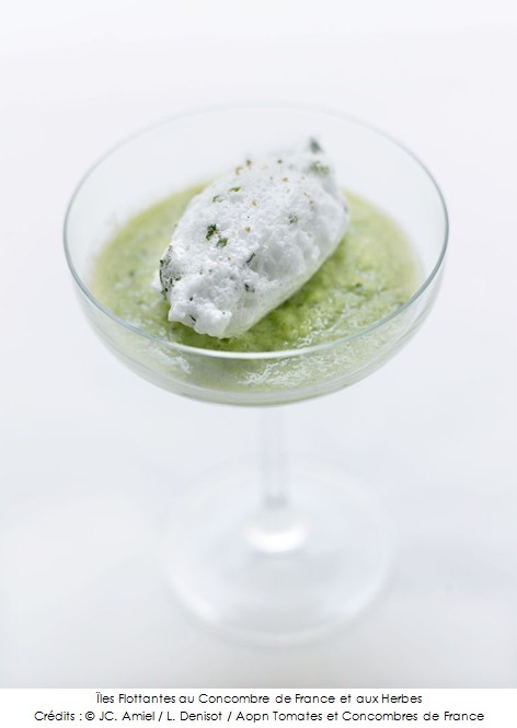3• Coupez les radis en tous petits cubes et déposez-en quelques-uns au fond de jolis verres de service. Couvrez de velouté de concombre bien froid et surmontez avec une île flottante aux herbes. Décorez avec un brin de ciboulette et des petits cubes de radis.