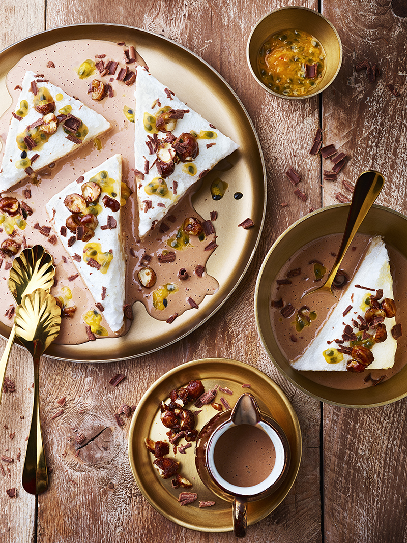 Astuce : au moment de servir, récupérez la pulpe d’un fruit de la passion supplémentaire et répartissez-la sur le dessus des iles flottantes, avec des copeaux de chocolat au lait et des noisettes concassées.