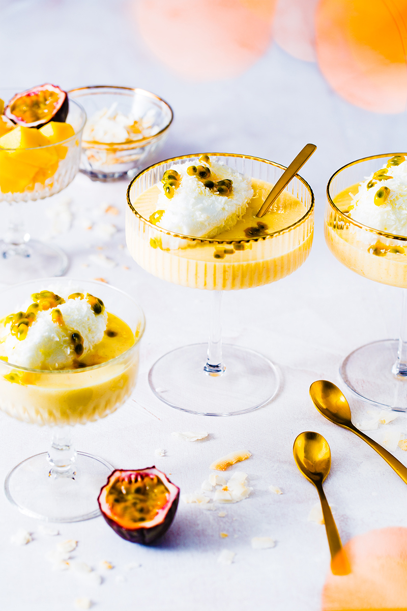 Astuces : pour préparer votre coulis maison, mixez et filtrez la pulpe de 2 fruits de la passion puis mixez avec 180 g de mangue. Si vous n’avez pas de four à micro-ondes, cuisez les blancs en neige 10 min environ au four à 120°C (Th.4).