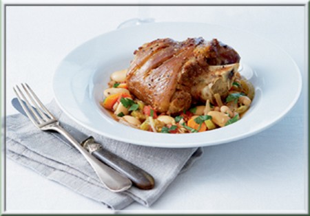 2.Préchauffez le four à 180°C (th.6). Otez la viande du bouillon. A l’aide d’un couteau, faites des incisions dans les jambonneaux. Enrobez-les de moutarde. Huilez un plat allant au four. Déposez la viande. Répartissez la carotte, le poireau et le céleri dans le fond du plat. Ajoutez une louche de bouillon. Faites rôtir 30 minutes au four. Ajoutez les haricots géants et blancs et les tomates pelées. Poursuivez la cuisson 10 minutes.