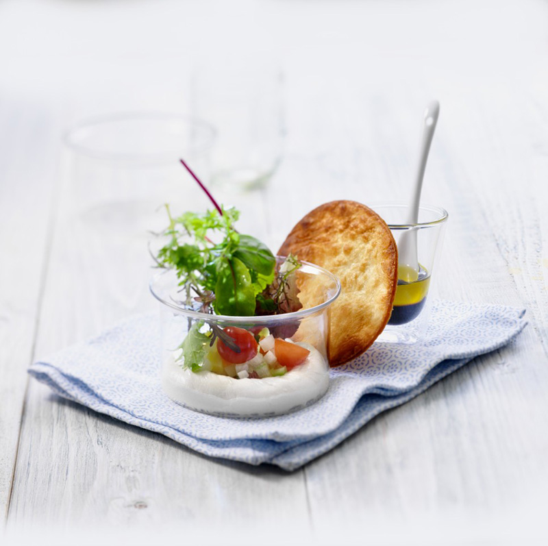 ③• Déposez 1 cuillerée à soupe de Chavroux dans 4 petits pots, puis ajoutez les légumes égouttés, les tomates cerise et le mesclun. Parsemez de coriandre, salez et poivrez. Arrosez d’une cuillerée à soupe de vinaigrette.