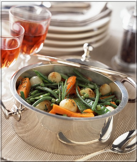 Pour servir, retirer la feuille de laurier et la branche de thym, puis verser la jardinière dans un légumier et parsemer de persil et de cerfeuil finement ciselés.