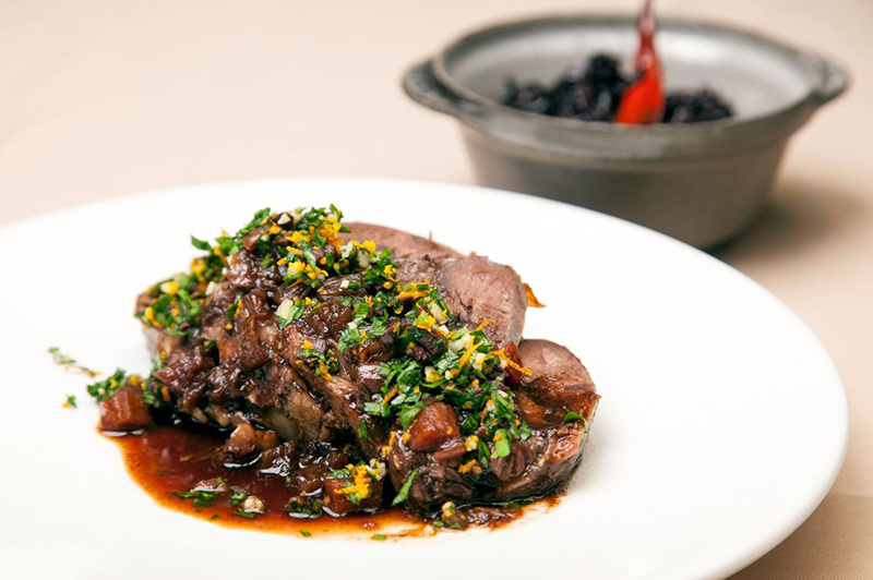 ②• Pour commencer, salez et poivrez le jarret de bœuf. Faites chauffer un peu d’huile d’olive dans une cocotte en fonte et, une fois celle-ci bien chaude, saisissez le bœuf jusqu’à ce qu’il soit brun sur toute sa surface. Retirez la viande de la cocotte et réservez.