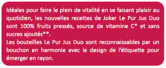 Pour dynamiser le lancement de sa nouvelle gamme Joker Le Pur Jus Duo, les bouteilles sont porteuses d’une offre promotionnelle 2 : 1 acheté = 1 offert.