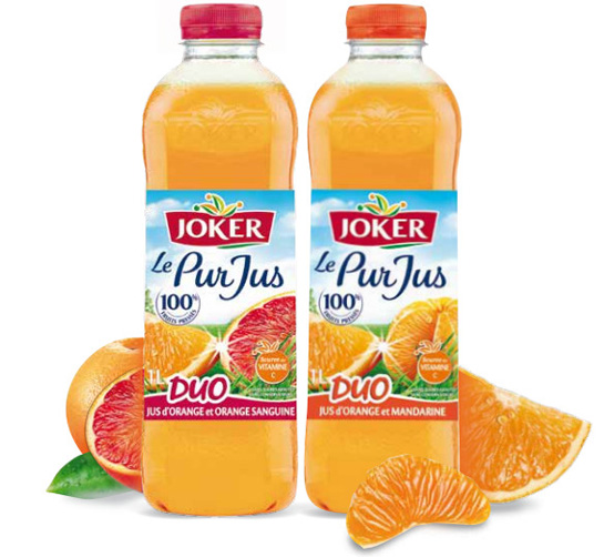 Les deux références Joker Le Pur Jus Duo qui viennent compléter la gamme Le Pur Jus sont conditionnées dans une bouteille PET d’un litre et disponibles dès à présent en GMS au prix de 2,10 € 1 .