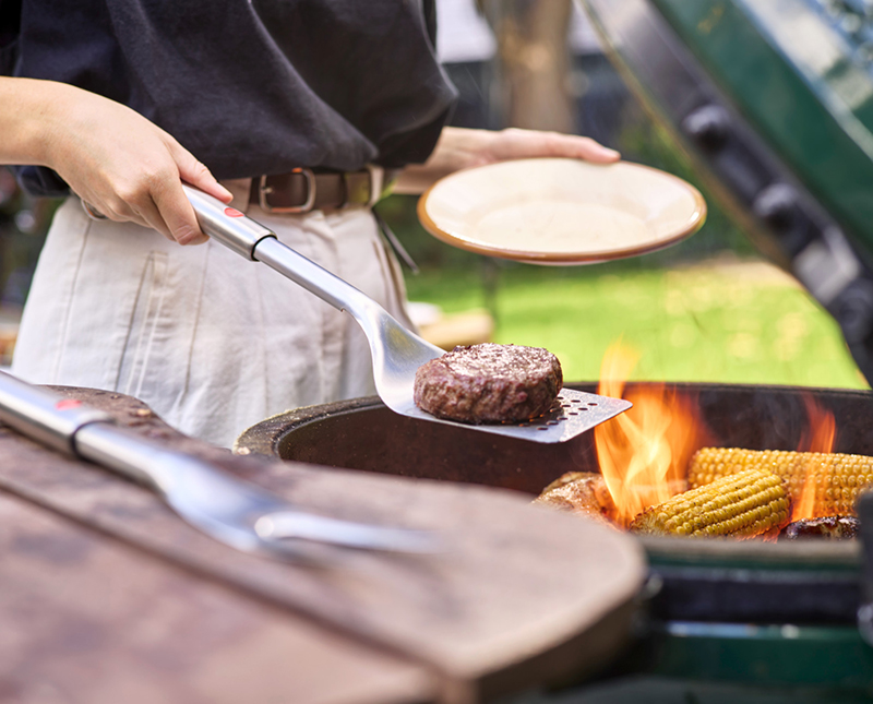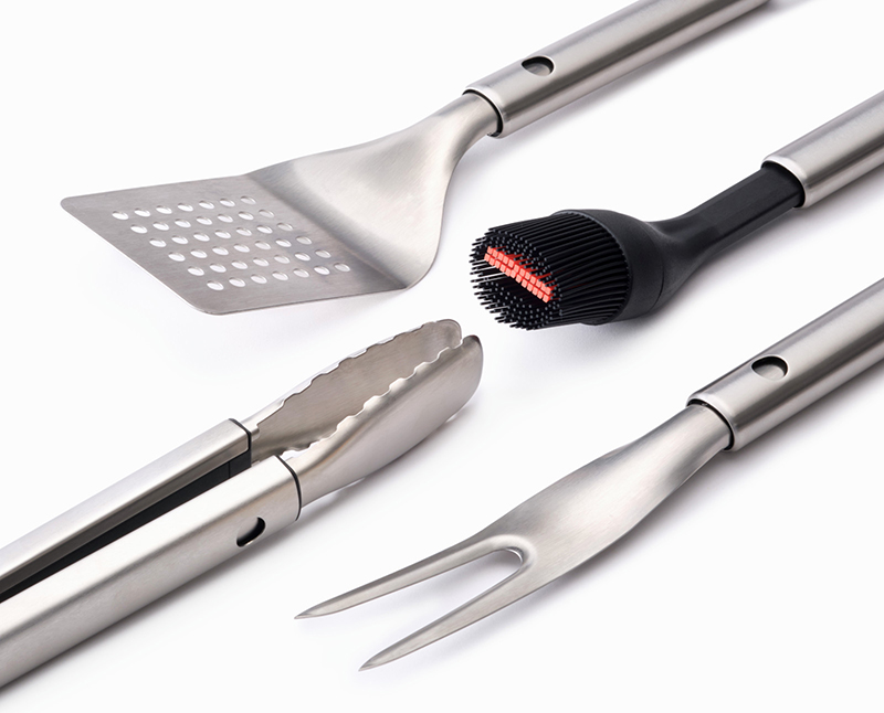 Les ustensiles GrillOut™ – pince, spatule, et fourchette – sont dotés d’un système rétractable unique qui permet de réduire leur encombrement une fois repliés.